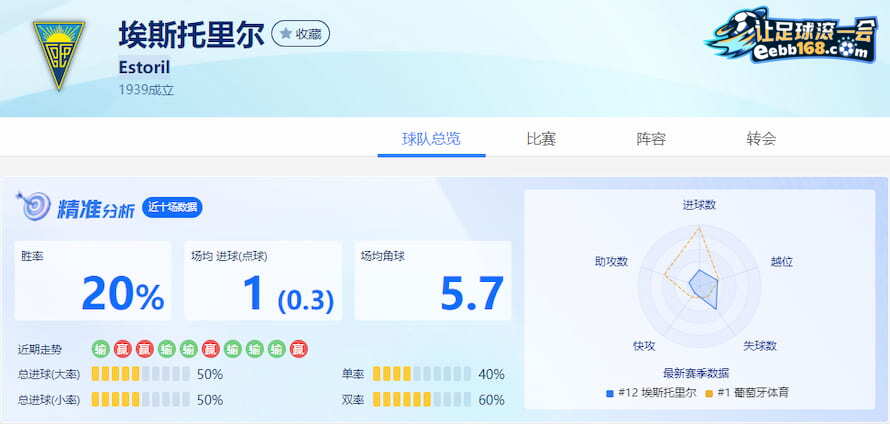 ◆埃斯托里尔队近10场得失分数据分析