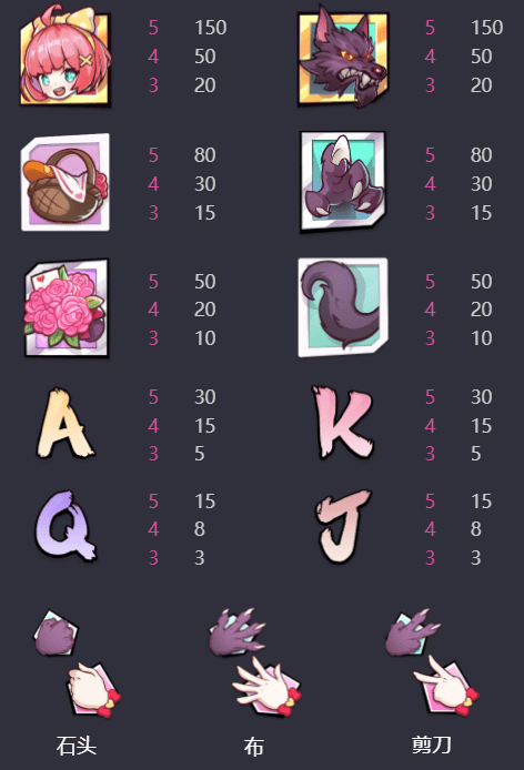 - 百搭符号:可替代除石头符号、布符号、剪刀符号、小红帽能量符号及大灰狼能量符号以外的所有符号。